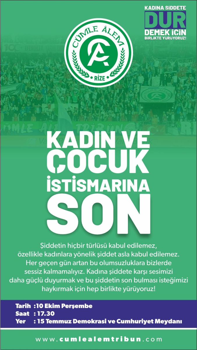Yaşanan olaylara tepki vermek için 10 Ekim Perşembe günü saat 17.30’da Rize 15 Temmuz Demokrasi ve Cumhuriyet Meydanı’nda toplanacak olan yeşil-mavili ekibin taraftar grubu, orada yapacağı basın açıklamasının ardından Atatürk ve Cumhuriyet Caddelerinde yürüyüş düzenleyerek “Kadın ve Çocuk İstismarına Son” demek için sesini haykıracak.