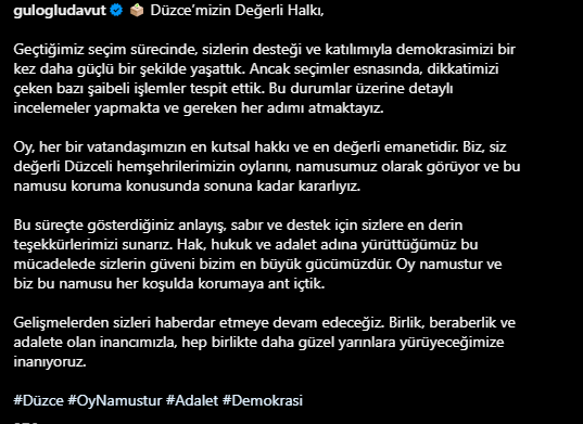 Geçtiğimiz seçim sürecinde, sizlerin desteği ve katılımıyla demokrasimizi bir kez daha güçlü bir şekilde yaşattık. Ancak seçimler esnasında, dikkatimizi çeken bazı şaibeli işlemler tespit ettik. Bu durumlar üzerine detaylı incelemeler yapmakta ve gereken her adımı atmaktayız.