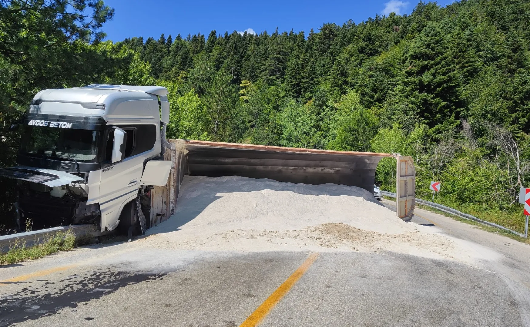 Karabük'ün Safranbolu ilçesinde devrilen kum yüklü tırın şoförü kazadan yara almadan kurtuldu.