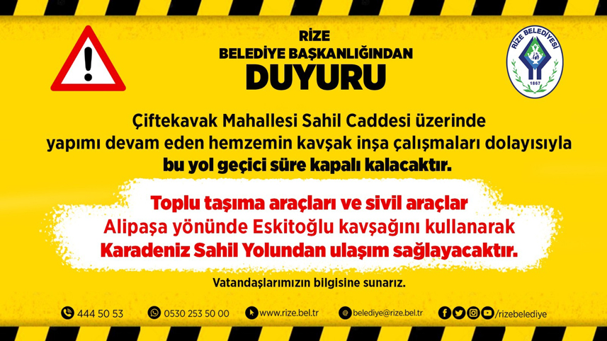Rize Belediyesi'nden yapılan açıklamada, Çiftekavak mahallesi Sahil caddesi üzerinde yapımı devam eden hemzemin kavşak inşa çalışmaları dolayısıyla bu yolun geçici süre ile kapalı kalacağı belirtildi.