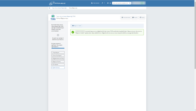 Gelen son sayfa ise başvurunun son sayfasıdır. Bu ekranı görmüş olmak başvurunun tamamlandığı anlamına gelmez, başvurunun başarıyla tamamlanması için site üzerindeki işlemlerin ardından belirtilen hesaba ödemenin gerçekleşmesi gerekmektedir. Tamamlanan başvuruların durumu `Başvuru Listesi` sayfasından takip edilebilir.