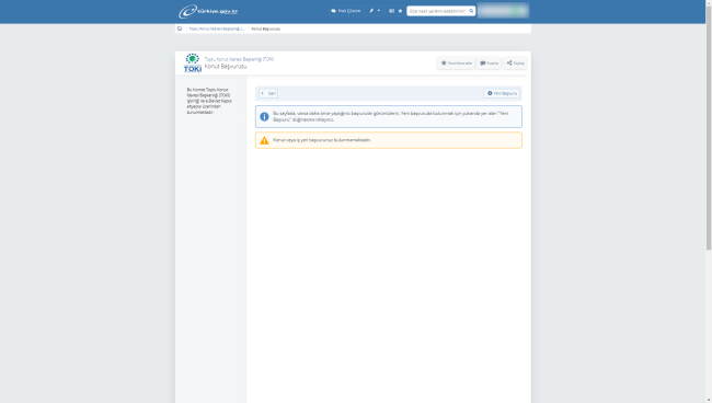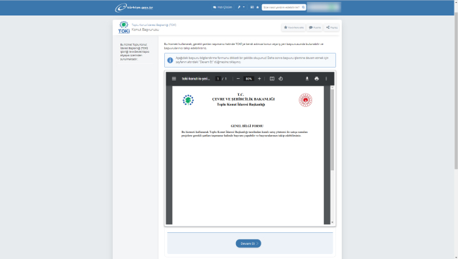 Başvuru için e-devlet sitesine giriş yapılarak, arama kısmından Toplu Konut İdaresi Başkanlığı (TOKİ) sayfasına girilir. Konut Başvurusu seçilir. Açılan sayfada başvuru bilgilendirme formunu okunduktan sonra Devam et butonuna tıklanır.