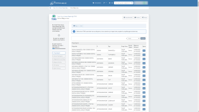 Başvurunun ilk adımı olarak tercih edilen sosyal konut projelerinden, başvurulmak istenen proje seçilir ve sayfanın alt kısmında bulunan `Devam et` butonuna tıklanır.