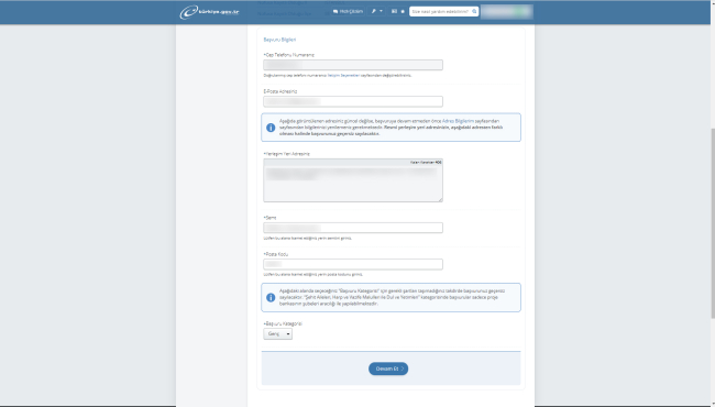 5. aşama: Bu ekranda yapılan başvuru henüz tamamlanmamıştır. Başvurunun tamamlanabilmesi için, doldurulan formun ön izlemesi başvuran kullanıcıya gösterilir. Formda yer alan verilerde eksik ya da hatalı bilgi var ise, önceki sayfaya dönülerek düzeltilmesi gerekir. Bilgiler eksiksiz ve doğru ise sayfanın alt kısmında önce `Başvuru Kategorisi` ardından da `Devam et` butonu seçilir.