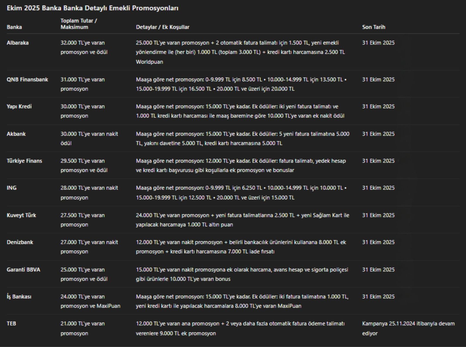 Ekim ayında bankalar arasındaki promosyon rekabeti zirveye çıktı. Bazı özel bankalar, emekli maaşını taşıyan müşterilere 32 bin TL’ye kadar nakit promosyon ödemesi sunmaya başladı.