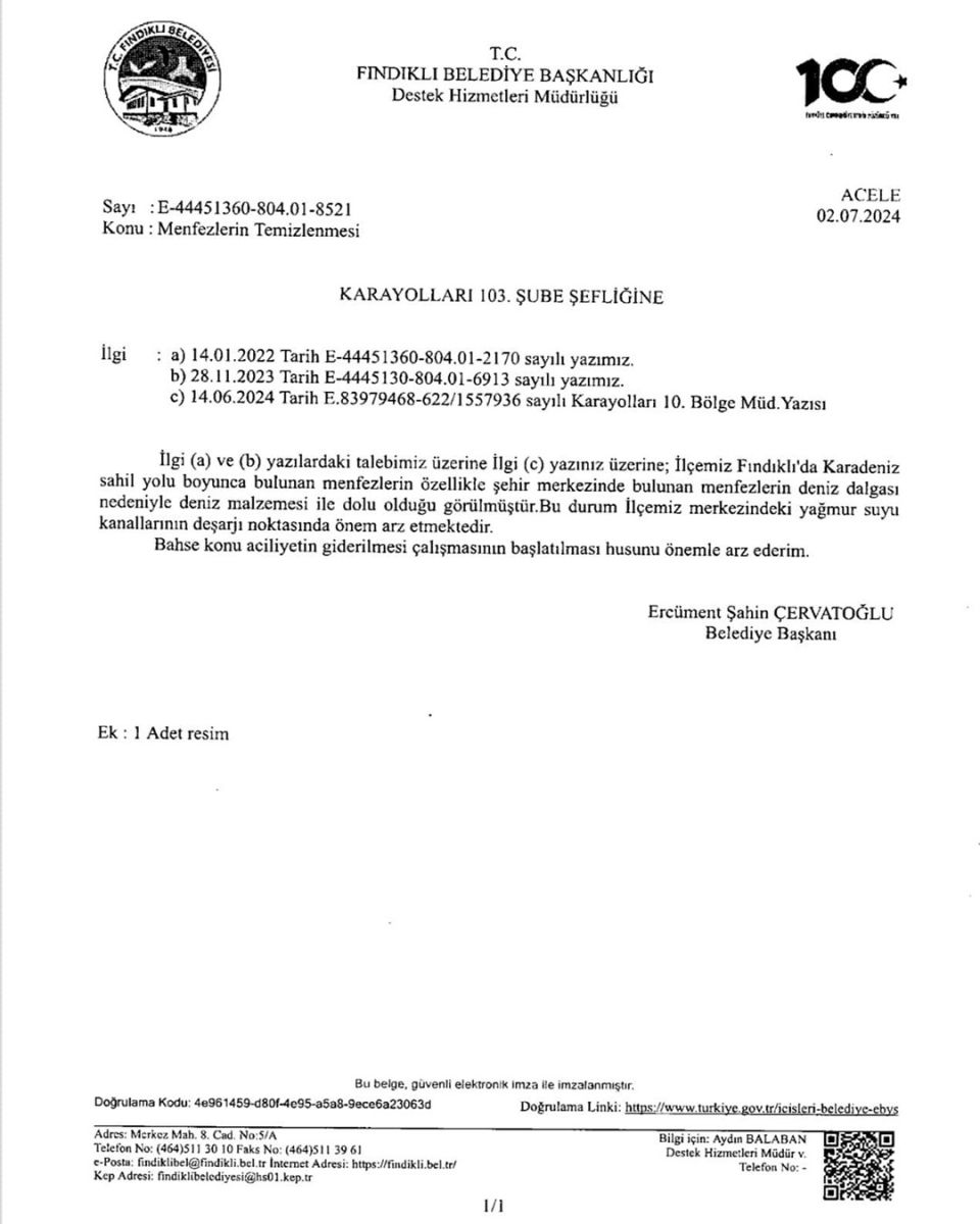 Belediyeden yapılan açıklamada, "İlçemiz yağmur suyu kanallarının karayollarına ait bölgedeki menfezlerin tıkanıklığının giderilmesi için yazılı ve sözlü acil taleplerimiz karşılanmamıştır." denildi.