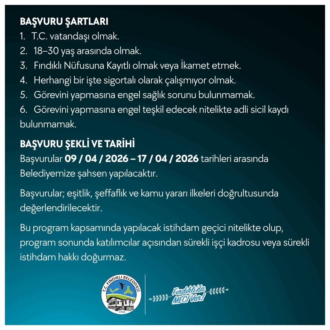 Açıklamada, Türkiye Cumhuriyeti vatandaşı olan, 18-30 yaş arasında Fındıklı nüfusuna kayıtlı veya ikamet eden kişilerin başvuru yapabileceği belirtildi.