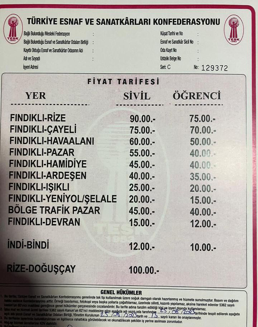 Rize'nin Fındıklı ilçesinde dolmuş fiyatları güncellendi.