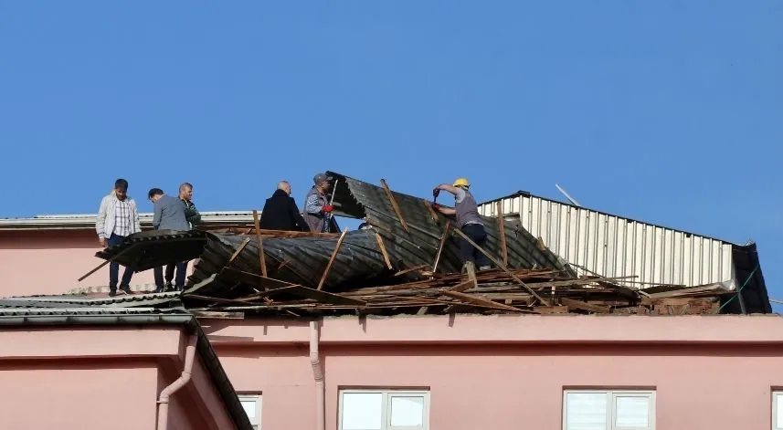 Çatıdan kopan parçalar, hastanenin bahçesine ve yola savruldu.