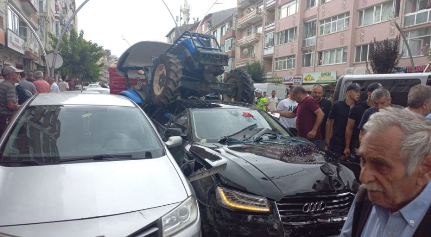 Traktör sürücüsü hafif yaralandı. Traktörün üzerine çıktığı araçta ve park halindeki otomobilde hasar oluştu.