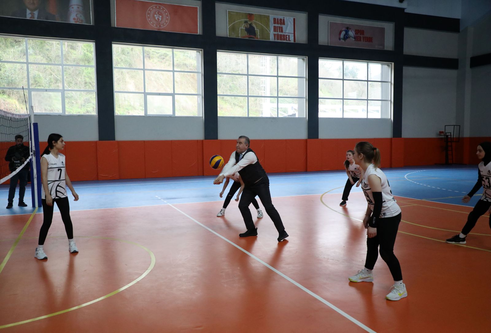 Rize'nin Çayeli ilçesinde yapımı tamamlanan Yaşar Yılmaz Spor Salonu'nda incelemelerde bulunan Bak, bir süre izlediği sporcularla voleybol oynadı.