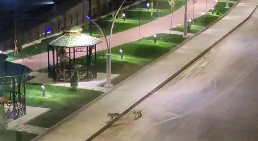 Yakınında apartmanlar, öğrenci yurtları, yüzme havuzu bulunan parkta dün gece kaydedilen görüntülere hızlı adımlarla parka giriş yapan iki tilkinin parkı gezmeleri, oyunlar oynamaları saniye saniye kaydedildi.