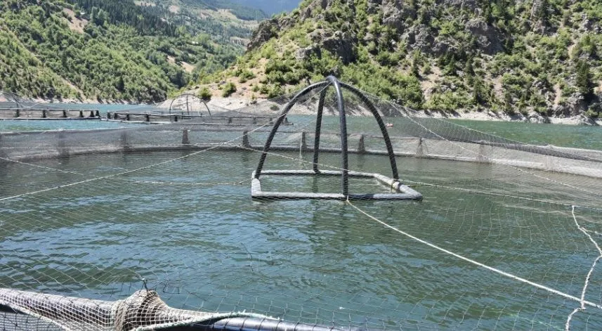Torul Barajı Kirazlık mevkisindeki alabalık işletme tesislerinde bulunan tekneye yüzerek gelen ayı, bir süre ağların olduğu bölümde yiyecek aradı.