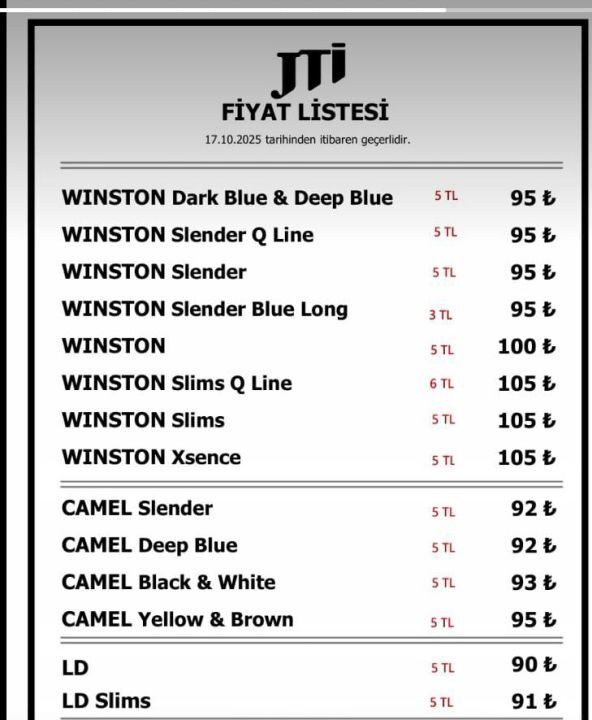 Yeni fiyat listesiyle birlikte JTI grubuna ait en ucuz sigara 90 TL'ye, en pahalı sigara ise 105 TL'ye yükseldi.