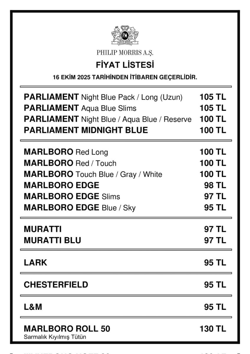 Philip Morris sigara grubu fiyatlarına ortalama 5 lira zam geldi. Yeni fiyat listesiyle birlikte bu gruptaki en pahalı sigara 105 TL'ye ulaşırken, en düşüğü 95 TL seviyesine çıktı.