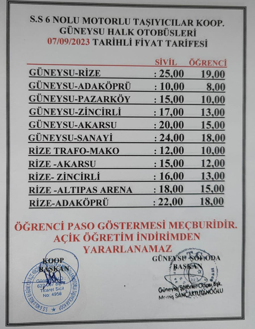 7 Eylül Perşembe günü yürürlüğe girecek olan yeni tarifeye göre, Güneysu-Rize güzergahı siviller için 25 TL, öğrenciler için de 19 TL'ye yükseldi.
