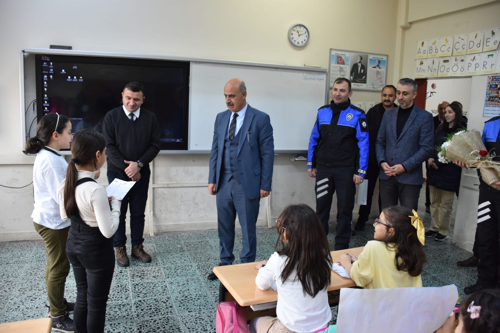 Açıklamada, Gökduman'ın pkul müdürü Lokman Baynazoğlu ve sınıf öğretmeni Ahmet Topal'ın öncülüğünde öğrenciler tarafından şiirler ve şarkılar eşliğinde karşılandığı, öğrenciler tarafından çizilen 'Polis, Polis Haftası ve İl Emniyet Müdürümüz' temalı resimlerin de kendisine takdim edildiği aktarıldı.