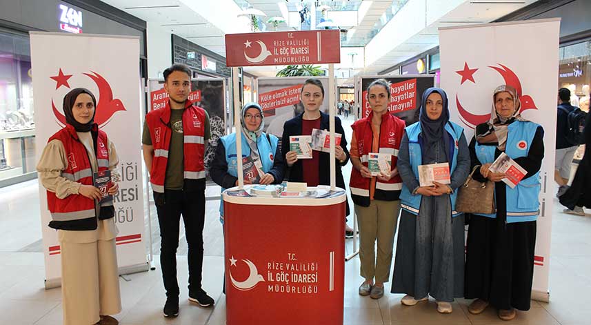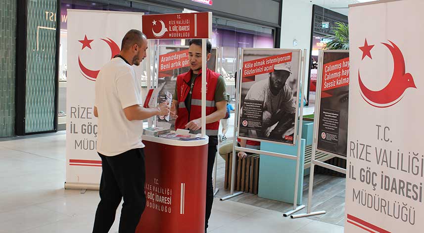 Rize İl Göç İdaresi Müdürlüğü tarafından İnsan Ticareti suçuna dikkat çekmek ve vatandaşlarımızın insan ticareti mağduru ile karşılaşması veya bu suçun işlendiğine dair şüpheye düşmesi durumunda Yabancılar İletişim Merkezini (YİMER 157) aramaları, il göç idaresi müdürlüklerimize veya kolluk birimlerimize ihbarda bulunmaları adına bilinç ve farkındalık oluşturmak amacıyla Şimal AVM’de kurulan stantta bilgilendirme faaliyeti gerçekleştirildi.