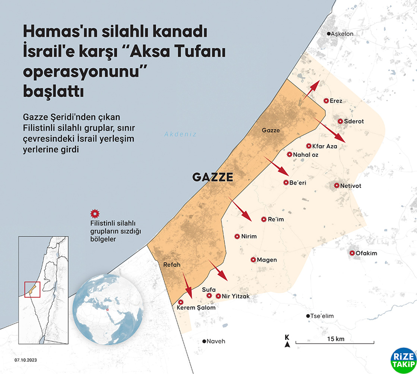 Sözcülük, İsrail güvenlik güçlerinin Gazze Şeridi'ne birkaç kilometre mesafede Beeri beldesinde gece boyunca 70-90 arası silahlı unsurla çatışmaya girdiğini, Filistinli silahlı grupların tamamının buradaki yerleşim yerine sızmayı başaramadığını ve çatışmaların sürdüğünü kaydetti.