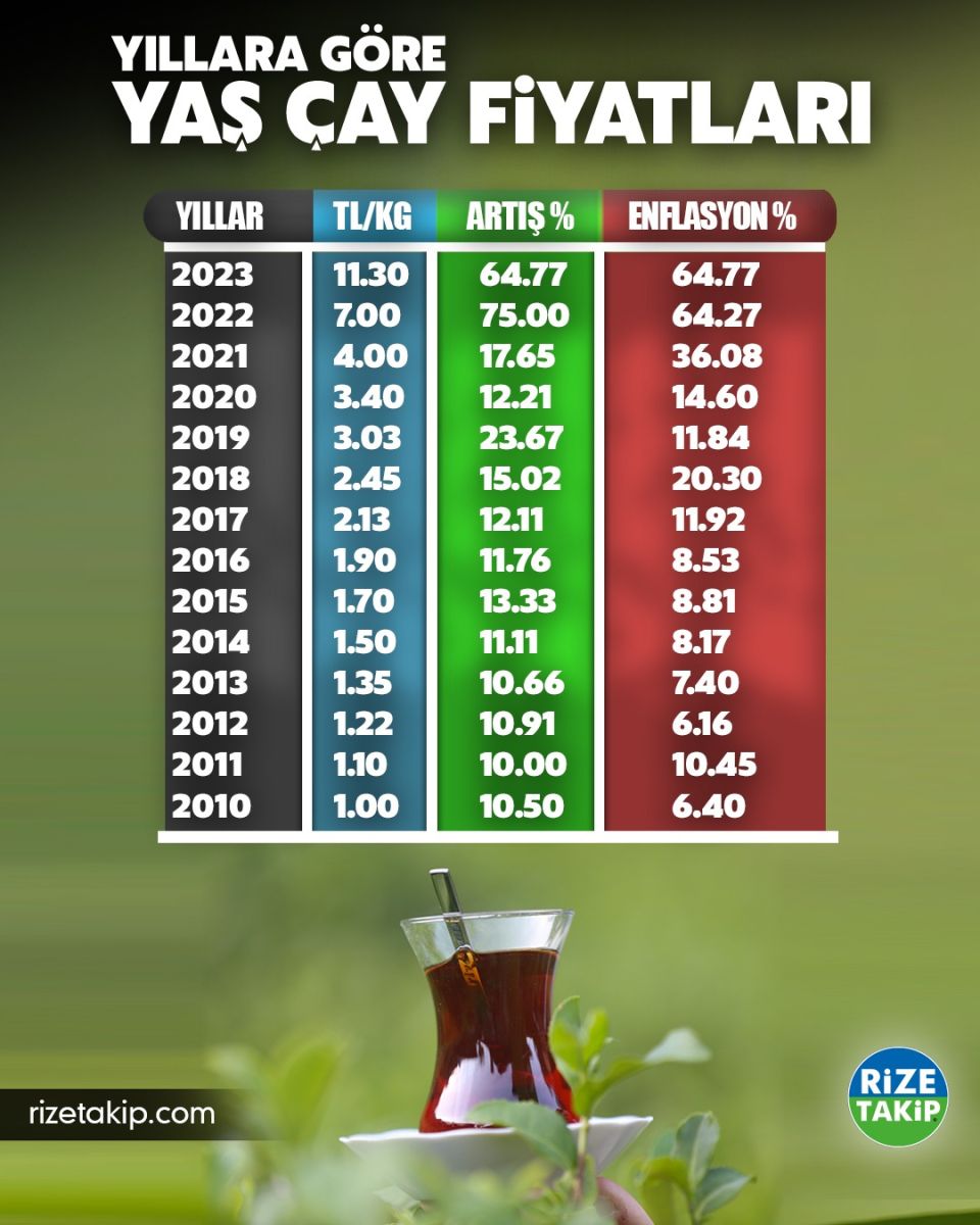 2021 yılında 4 TL olan yaş çay alım fiyatı, 2022 yılında yüzde 64,27 oranındaki enflasyonda yüzde 75 oranında zam alarak 4 TL’den 7 TL seviyesine çıkarken, 2023 yılında ise yüzde 64,77’lik artış (enflasyon ile aynı oranda) ile 11.30 TL oldu.