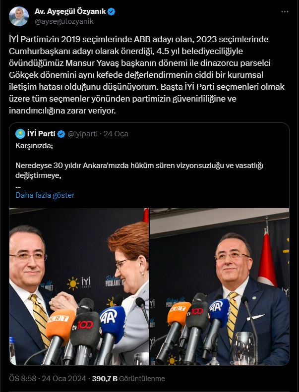 Özyanık, sosyal medya hesabından yaptığı açıklamada, "İYİ Partimizin 2019 seçimlerinde ABB adayı olan, 2023 seçimlerinde Cumhurbaşkanı adayı olarak önerdiği, 4.5 yıl belediyeciliğiyle övündüğümüz Mansur Yavaş başkanın dönemi ile dinazorcu parselci Gökçek dönemini aynı kefede değerlendirmenin ciddi bir kurumsal iletişim hatası olduğunu düşünüyorum. Başta İYİ Parti seçmenleri olmak üzere tüm seçmenler yönünden partimizin güvenirliliğine ve inandırıcılığına zarar veriyor." diye konuştu.
