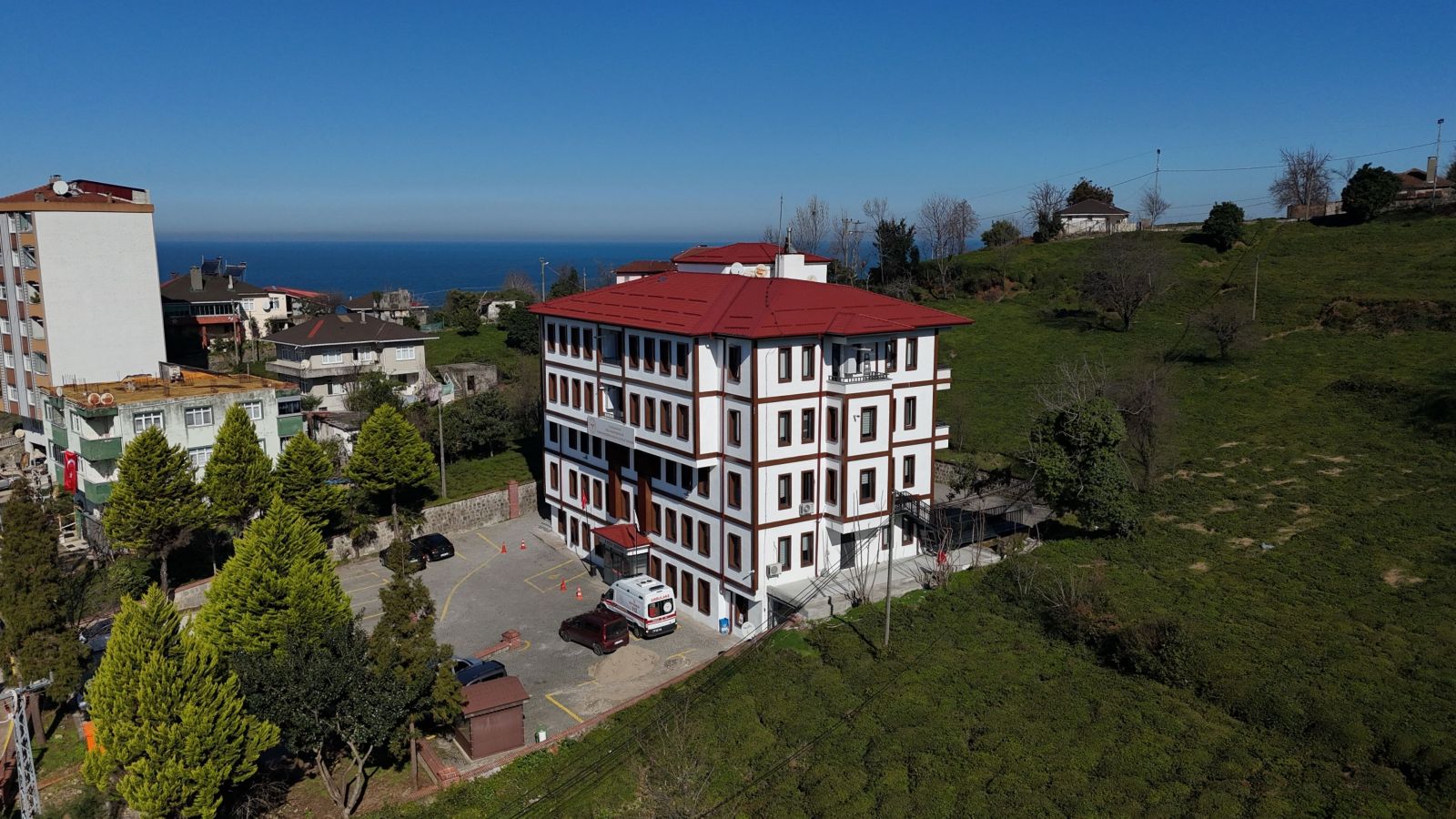 Denize hakim bir tepede konumlanan hastane, Karadeniz’in mavi tonları ile yeşil doğasını bir arada gören konumuyla öne çıkıyor. Yenilenen dış cephesi ve kırmızı çatısıyla bölge mimarisiyle uyum sağlayan bina, çevresiyle bütünlük oluşturuyor.