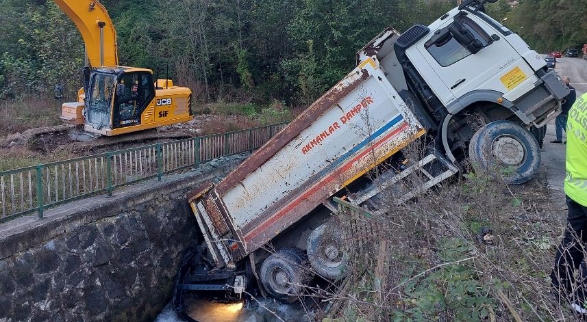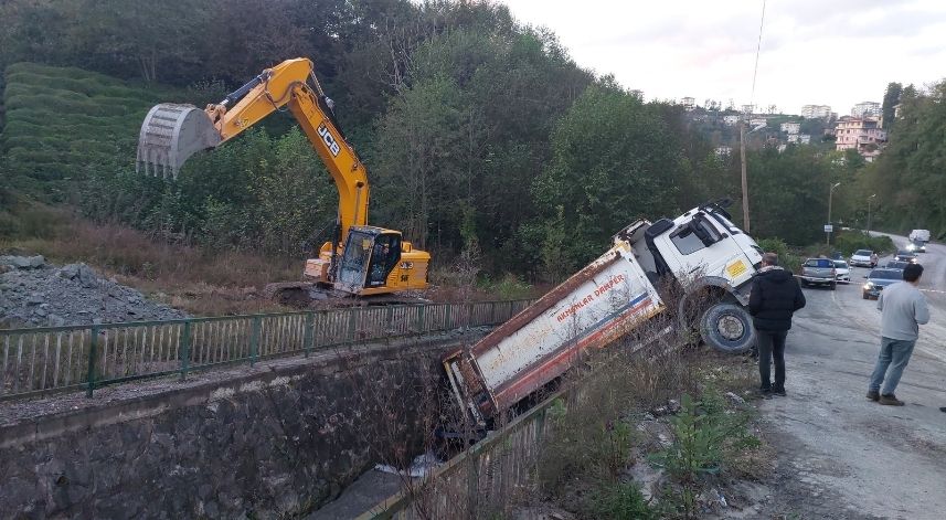 Rize'de şantiyelerin yoldaki deformasyonu nedeniyle geri geri kayan kamyon altına aldığı otomobille birlikte dere yatağına düştü. Kaza maddi hasarla atlatıldı.