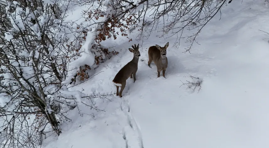 Şenpazar ilçesinde doğada dronla kar videosu çeken Kubilay Onurcan Çalık, karın üzerinde karacaların yürüdüğünü fark etti.
