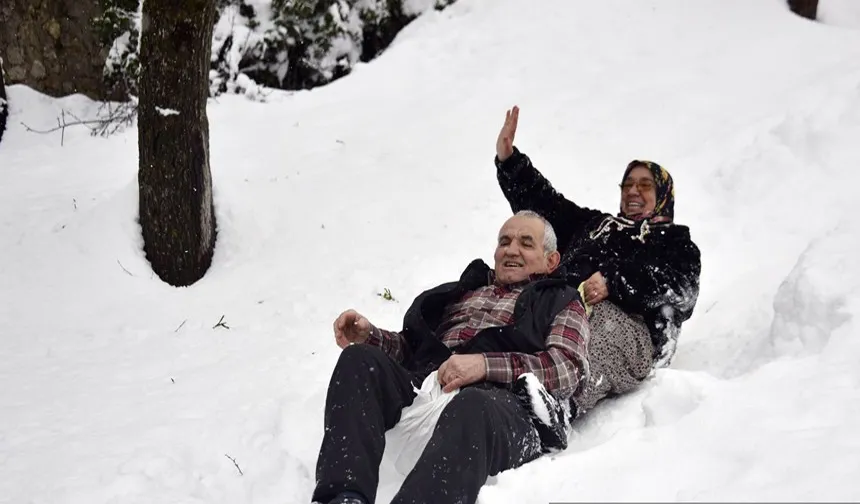 Kastamonu'da etkili olan kar yağışının ardından poşetlerle kayarak beyaz örtünün tadını çıkaran İsa ve Fatma Tığlı çifti, çocukluklarındaki gibi eğlenmenin mutluluğunu yaşadı.