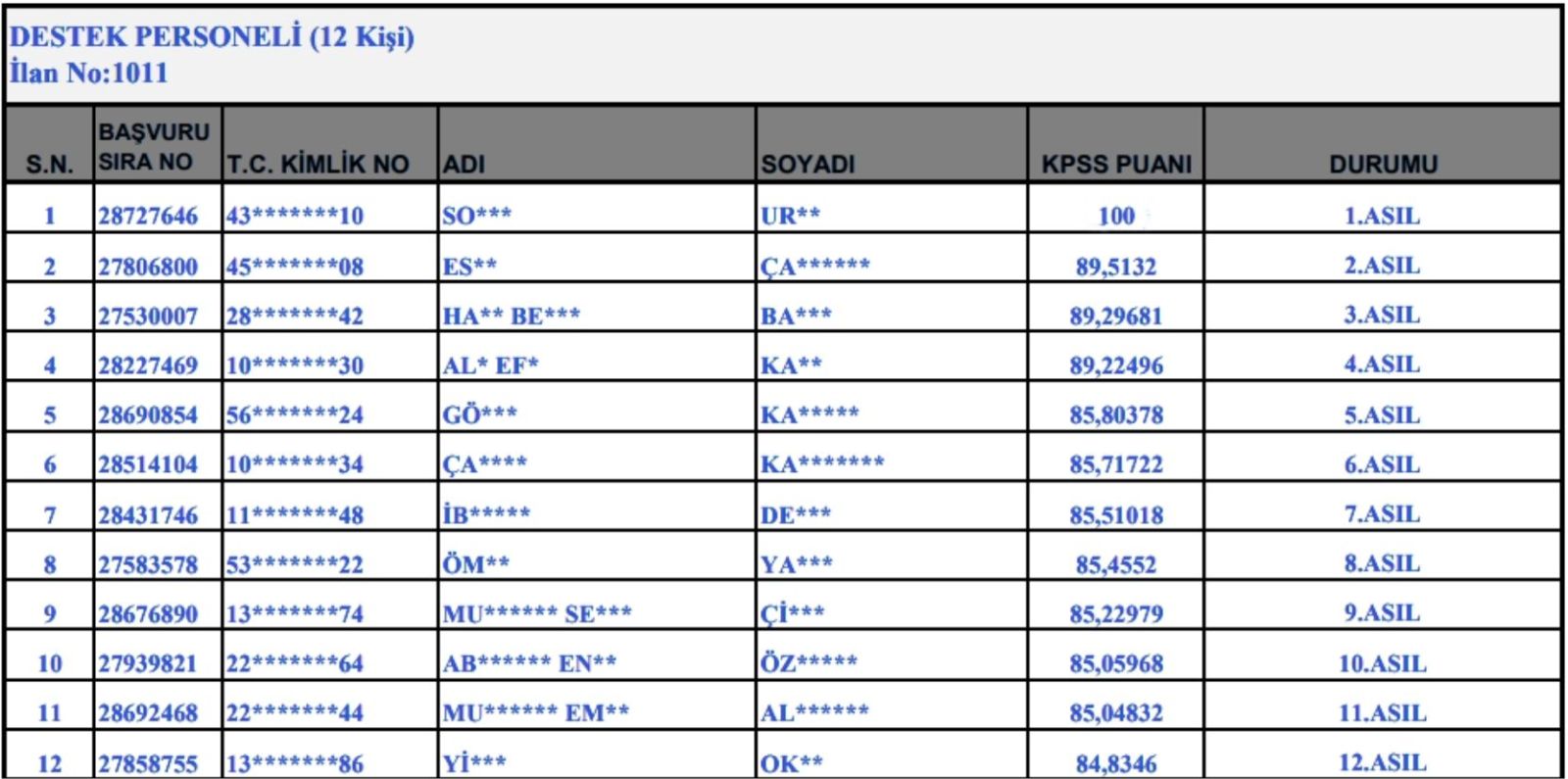 Personel alımı için başvurular Aralık ayı sonunda tamamlanmış, sonuçlar ise bugün itibarıyla ilan edilmişti. Açıklanan sonuç tablosunda, 12 temizlik görevlisi kadrosu için yapılan sıralamada farklı KPSS puanlarına sahip adayların yerleştirildiği görüldü.