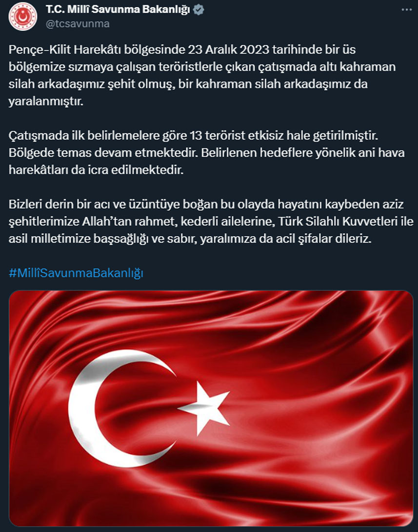 Bakanlıktan yapılan yazılı açıklamada, "Pençe- Kilit Harekatı bölgesinde 23 Aralık 2023 tarihinde bir üs bölgemize sızmaya çalışan teröristlerle çıkan çatışmada 6 kahraman silah arkadaşımız şehit olmuş, 1 kahraman silah arkadaşımız da yaralanmıştır. Çatışmada ilk belirlemelere göre 13 terörist etkisiz hale getirilmiştir. Bölgede temas devam etmektedir. Belirlenen hedeflere yönelik ani hava harekatları da icra edilmektedir." denildi.