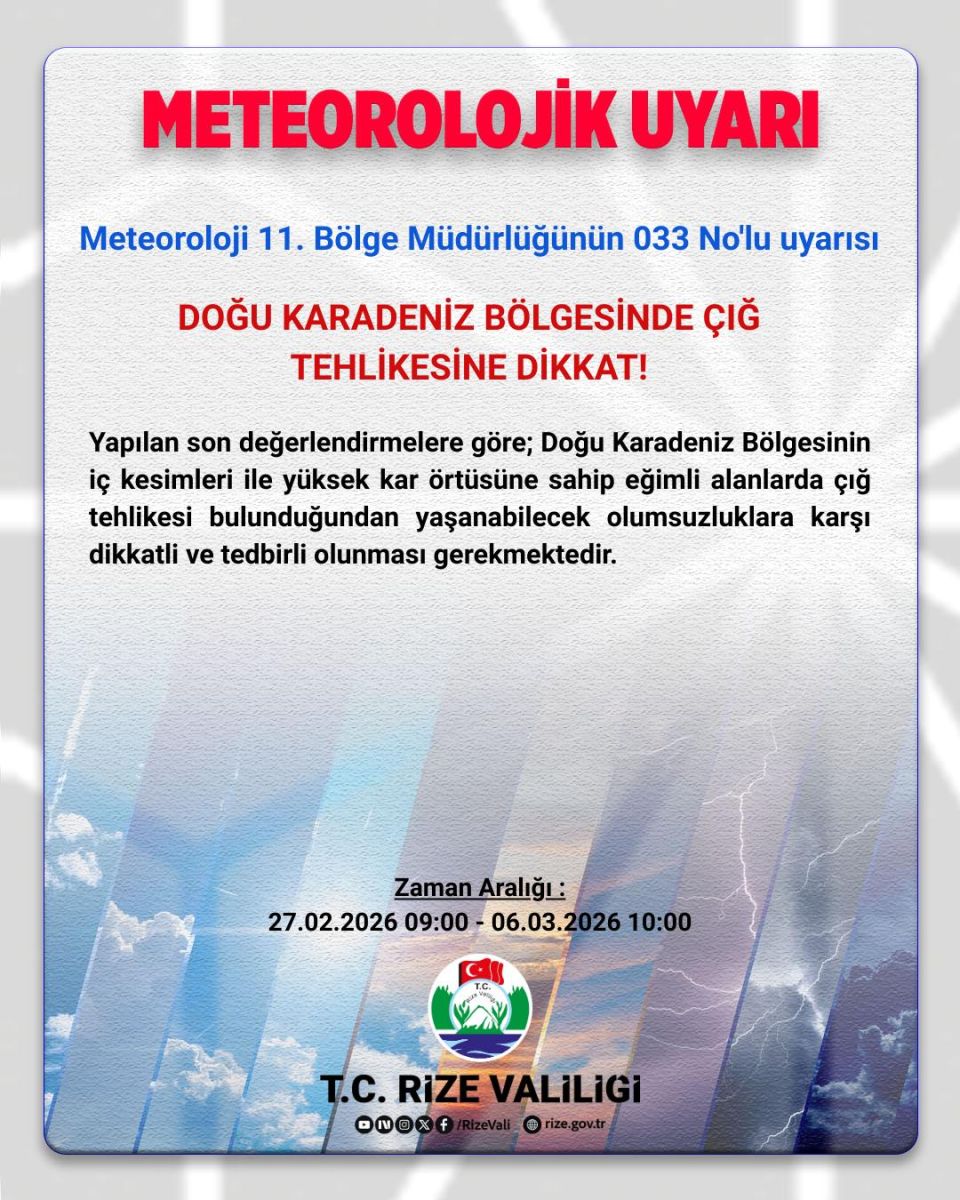 Meteoroloji 11. Bölge Müdürlüğü tarafından yayımlanan 033 No’lu meteorolojik uyarıda, Doğu Karadeniz Bölgesi’nde çığ tehlikesine karşı dikkatli ve tedbirli olunması gerektiği bildirildi.