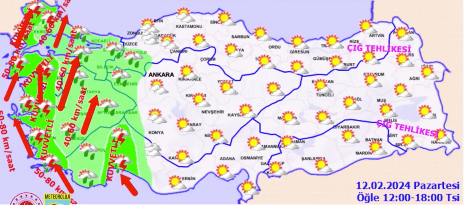 Uyarı alan iller şöyle; Ağrı, Artvin, Aydın, Balıkesir, Bitlis, Çanakkale, Edirne, Erzurum, Giresun, Hakkari, İzmir, Kars, Kırklareli, Manisa, Muğla, Muş, Rize, Trabzon, Van, Şırnak, Ardahan ve Iğdır.