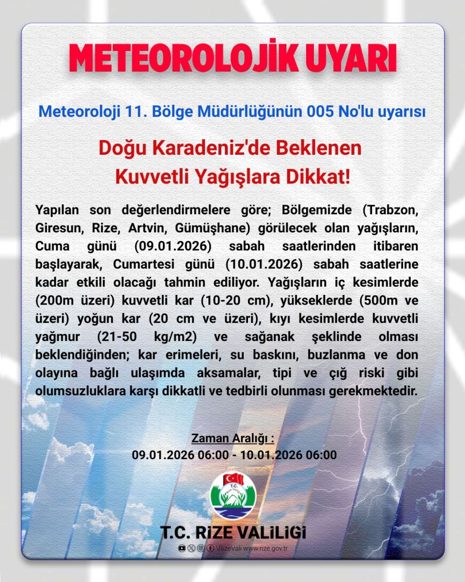 Yapılan son değerlendirmelere göre; Trabzon, Giresun, Rize, Artvin ve Gümüşhane illerinde görülecek yağışların, 09 Ocak 2026 Cuma günü saat 06.00’dan itibaren başlayarak 10 Ocak 2026 Cumartesi günü saat 06.00’ya kadar etkili olacağı tahmin ediliyor.