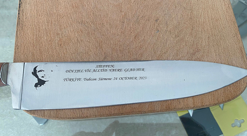 Ailenin Sürmene’ye oğullarının özel eşyalarını almak üzere geleceğini öğrenen ve aynı zamanda Sürmene Belediye meclis üyesi olan bıçak imalatçısı Atakan Berk, aileyi iş yerine davet ederek üzerinde oğullarının resminin bulunduğu Norveç dilinde “Ruhu burada her zaman mutlu olacak” yazılı bir bıçak hediye etti. Bıçağı alan anne Monika Snppene, gözyaşlarına hakim olamazken, oğullarının 20 Ağustos’ta ülkeden ayrıldığını ve son olarak ölüm haberini aldıklarını söyledi. Norveçli aile ile dil çeviri arama motoru üzerinden anlaşan Berk, aileye bıçağı hediye etti. Aldıkları hediye karşısında duygulanan aile ardından ilçeden ayrıldı.