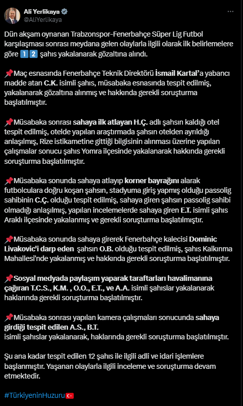 Bakan Yerlikaya, sosyal medya hesabından yaptığı paylaşımda, maç esnasında Fenerbahçe Teknik Direktörü İsmail Kartal'a yabancı madde atan C.K'nin müsabaka esnasında tespit edilip, gözaltına alındığını ve hakkında gerekli soruşturmanın başlatıldığını belirterek, şunları kaydetti: