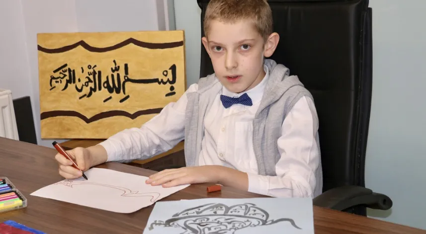 Trabzon'da Çukurçayır Ortaokulu özel eğitim sınıfı öğrencisi 11 yaşındaki Yusuf Sait Kaya, Kur'an kursu duvarında gördüklerini çizerek kendi kendine hat yazmaya başladı.