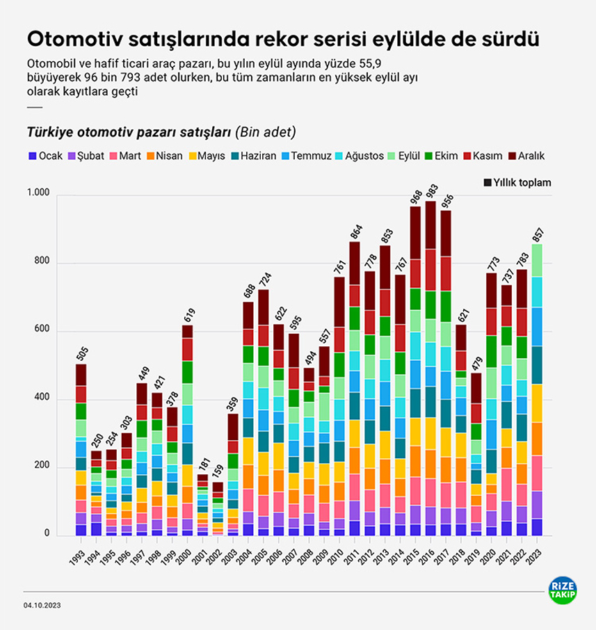 Otomotiv Distribütörleri ve Mobilite Derneği (ODMD) eylül ayı verilerine göre, Türkiye otomobil ve hafif ticari araç toplam satışları, 2023 yılı ocak-eylül döneminde bir önceki yılın aynı dönemine göre yüzde 64,8 artarak 857 bin 575 adet olarak gerçekleşti.
