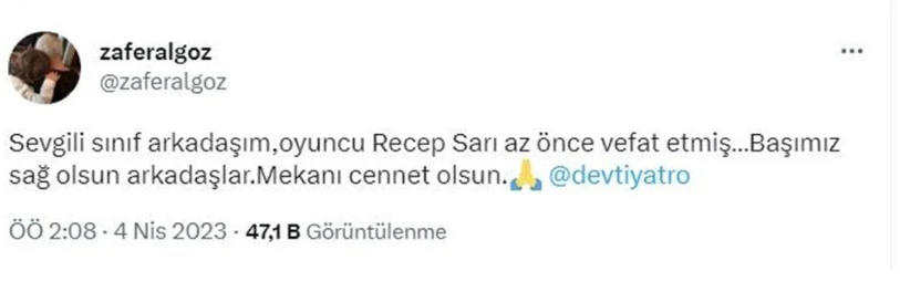Recep Sarı'nın vefat haberini arkadaşı ve meslektaşı Zafer Algöz duyurdu. Algöz sosyal medya hesabından yaptığı paylaşımda; "Sevgili sınıf arkadaşım,oyuncu Recep Sarı az önce vefat etmiş…Başımız sağ olsun arkadaşlar.Mekanı cennet olsun." ifadelerini kullandı.