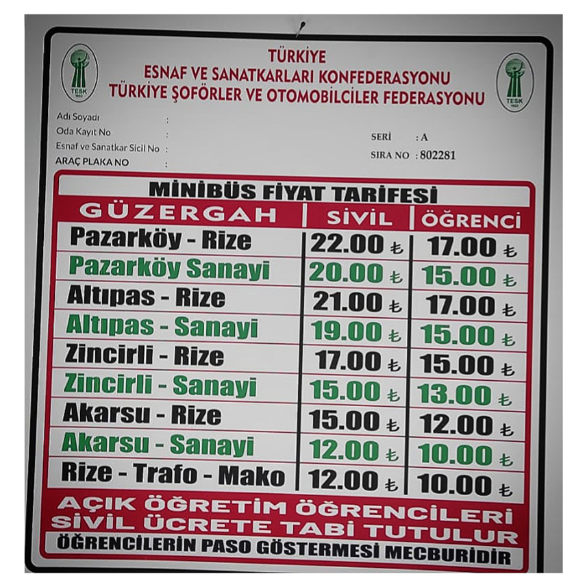Rize'nin Merkeze bağlı Pazarköy Köy'ü dolmuş fiyatları güncellendi.