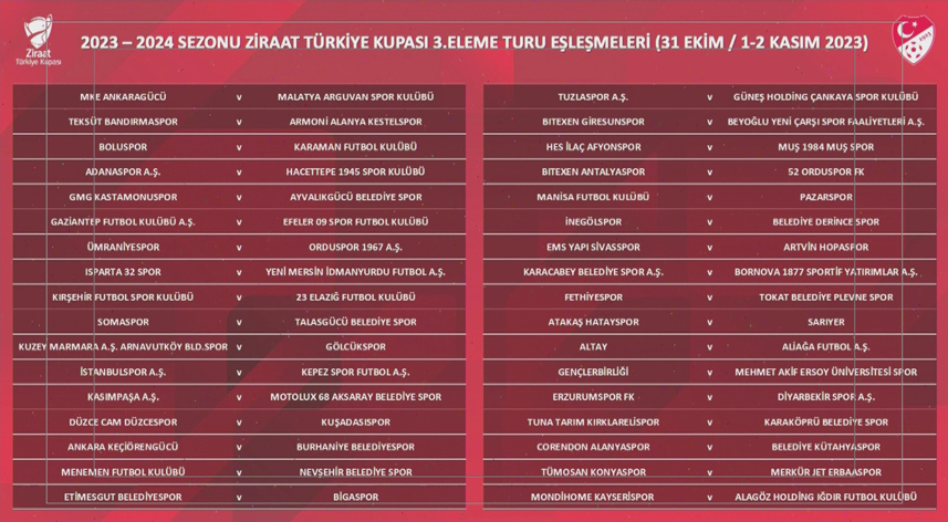 Ziraat Türkiye Kupası 3. Tur müsabakaları 31 Ekim -1-2 Kasım 2023 tarihlerinde oynanacak.