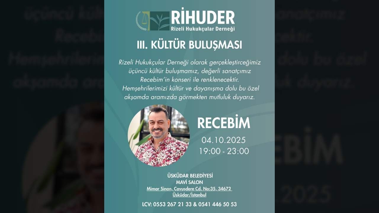 RİHUDER'den yapılan açıklamada, "Gerçekleştirceğimiz '3. Kültür Buluşması' etkinliğimiz değerli sanatçımız Recebim’in konseri ile renklenecektir. Hemşehrilerimizi kültür ve dayanışma dolu bu özel akşamda aramızda görmekten mutluluk duyarız." denildi.