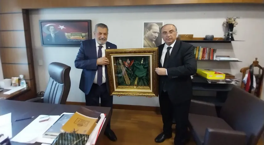 RİDEF Genel Başkanı Muammer Bostan ile yönetim kurulu, CHP Rize Milletvekili Tahsin Ocaklı'ya Rize Günleri anısına çay, kemençe ve tulum figürlerinden oluşan tablo hediye etti.