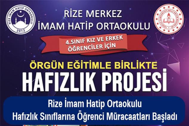 Milli Eğitim Bakanlığı (MEB), “imam hatip ortaokullarında örgün eğitimle birlikte hafızlık” projesi kapsamında Rize Merkez İmam Hatip Ortaokulu (RİHO) 4. Sınıfı bitirip 5. Sınıfa kayıt olacak olan ve hafızlık eğitimi alarak okumak isteyen kız ve erkek öğrencilere kapılarını açarak müracaatları almaya başladı. Proje kapsamında Akademik Sınavla yapılacak seçim sonucunda 40 kız ve 40 erkek öğrencinin alınması planlanıyor.