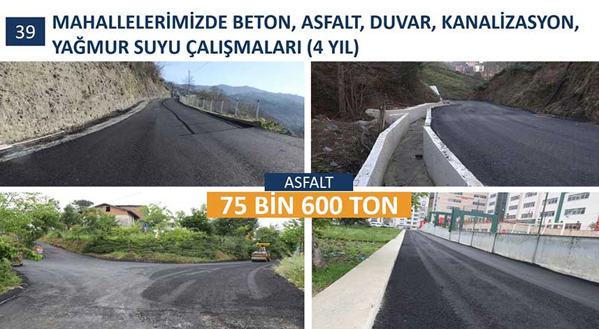 Rize Belediyesi'nin paylaştığı verilere göre, yürütülen altyapı ve yol proje çalışmaları sürecinde toplam 75 bin 600 ton asfalt, 37 bin 226 metreküp beton kullanılarak, yol yapımına önemli katkı sağlandığı ayrıca 49 bin 000 metreküp taş duvar ve 21 bin 550 metreküp perde duvar inşa edilerek, çevre düzenlemeleri gerçekleştirildiği belirtildi.