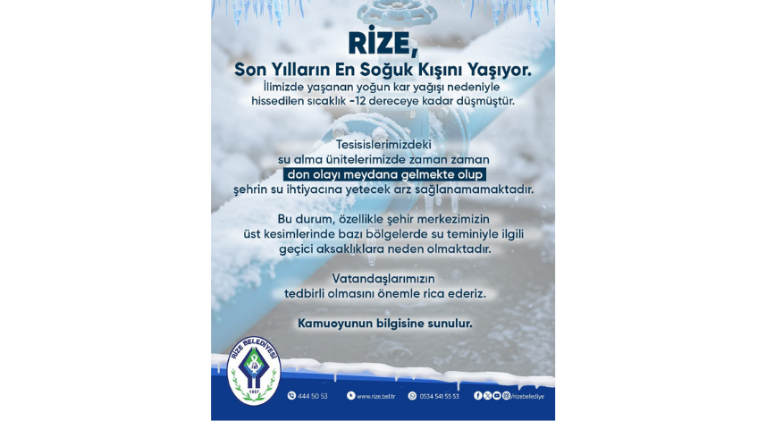 Rize Belediyesi, son yılların en soğuk kışının yaşandığı şehirde, yoğun kar yağışı ve hissedilen sıcaklığın -12 dereceye kadar düşmesi nedeniyle vatandaşları bilgilendirdi.