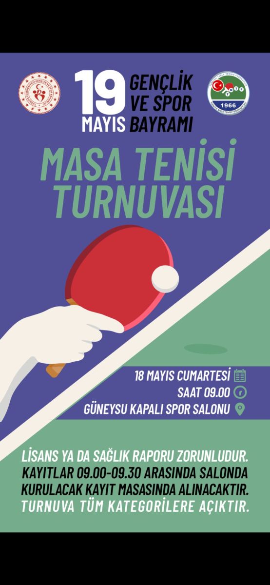 Gençlik ve Spor Bakanlığı ile Türkiye Masa Tenisi Federasyonu işbirliğinde düzenlenecek olan turnuva 18 Mayıs Cumartesi günü, saat 09.00’da Güneysu Kapalı Spor Salonu’nda organize edilecek.