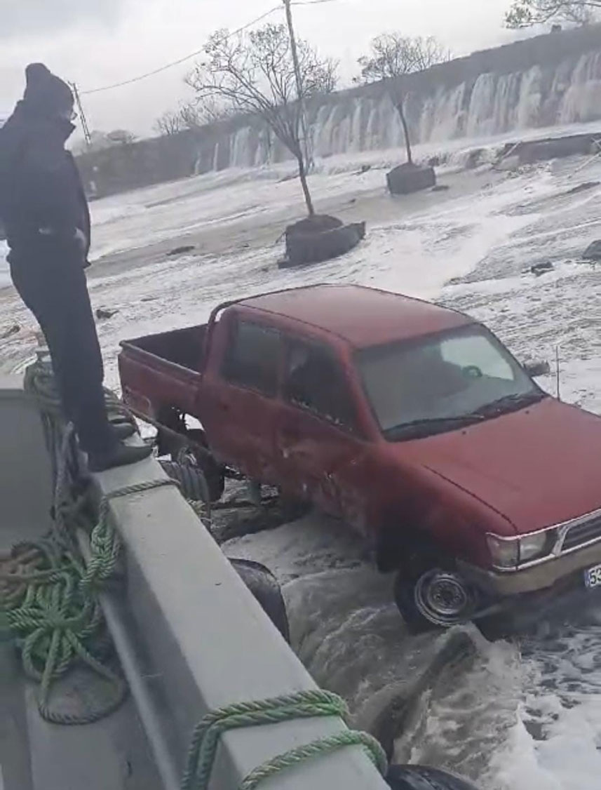 Rize’de şiddetli fırtına nedeniyle Gündoğdu mahallesi Balıkçı Barınakları'nda biri tır olmak üzere 3 araç dalgalardan hasar gördü, 1 kamyonet denize düştü.