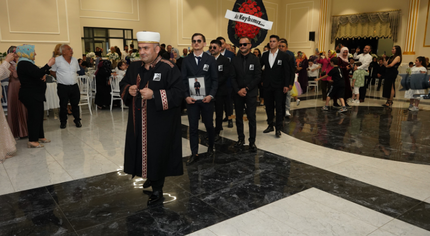 Gelin ve damadın mesai arkadaşları salona "Acı kaybımız" yazılı çelenk ve temsili imam ile girdi, salondakiler gülmekten kırıldı.
