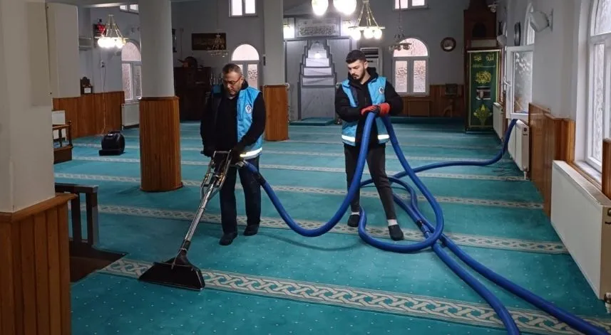 Camilerin şadırvanları, ayakkabılıkları, halıları detaylı olarak temizlenip hijyenik hale getiriliyor.